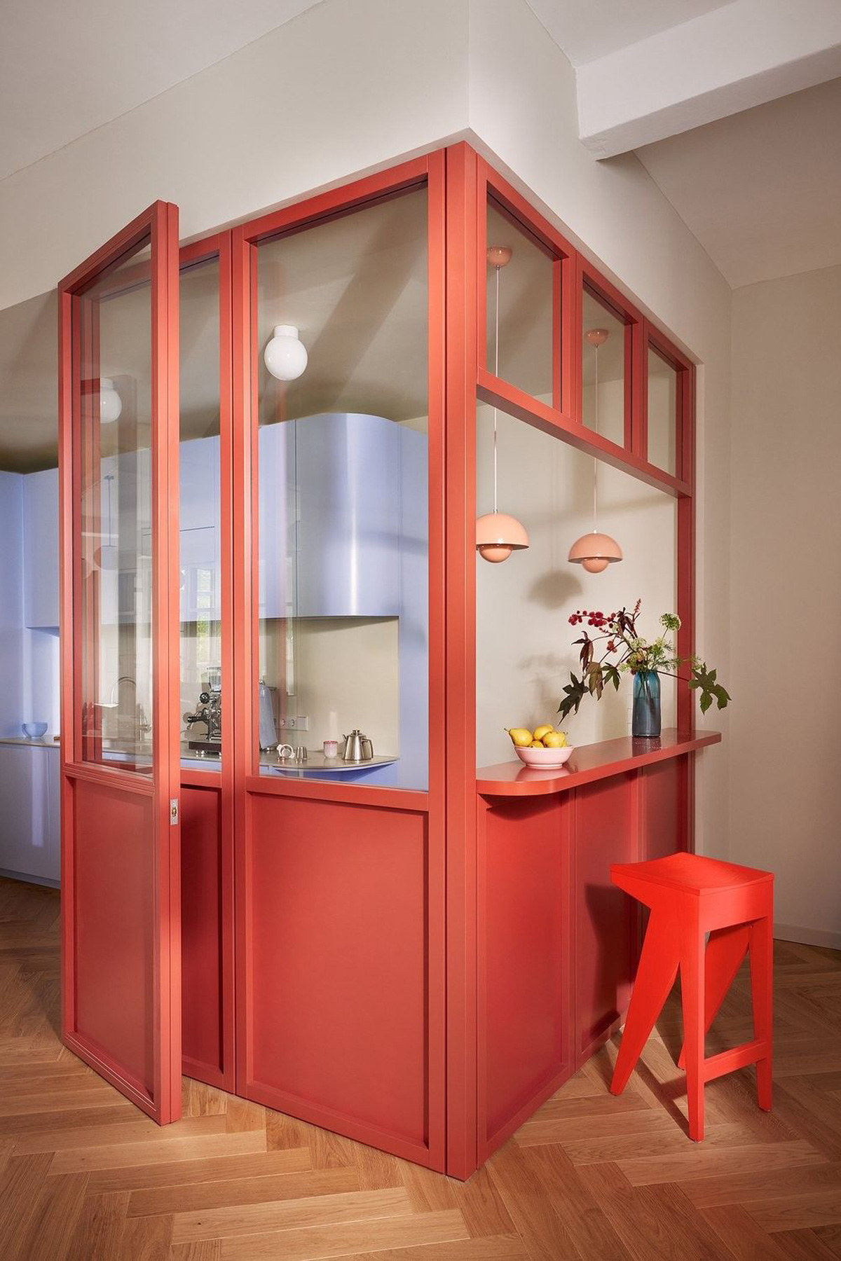 Appartement rétro chic, avec une grande verrière en hauteur avec des contour en bois, qui coulisse.
