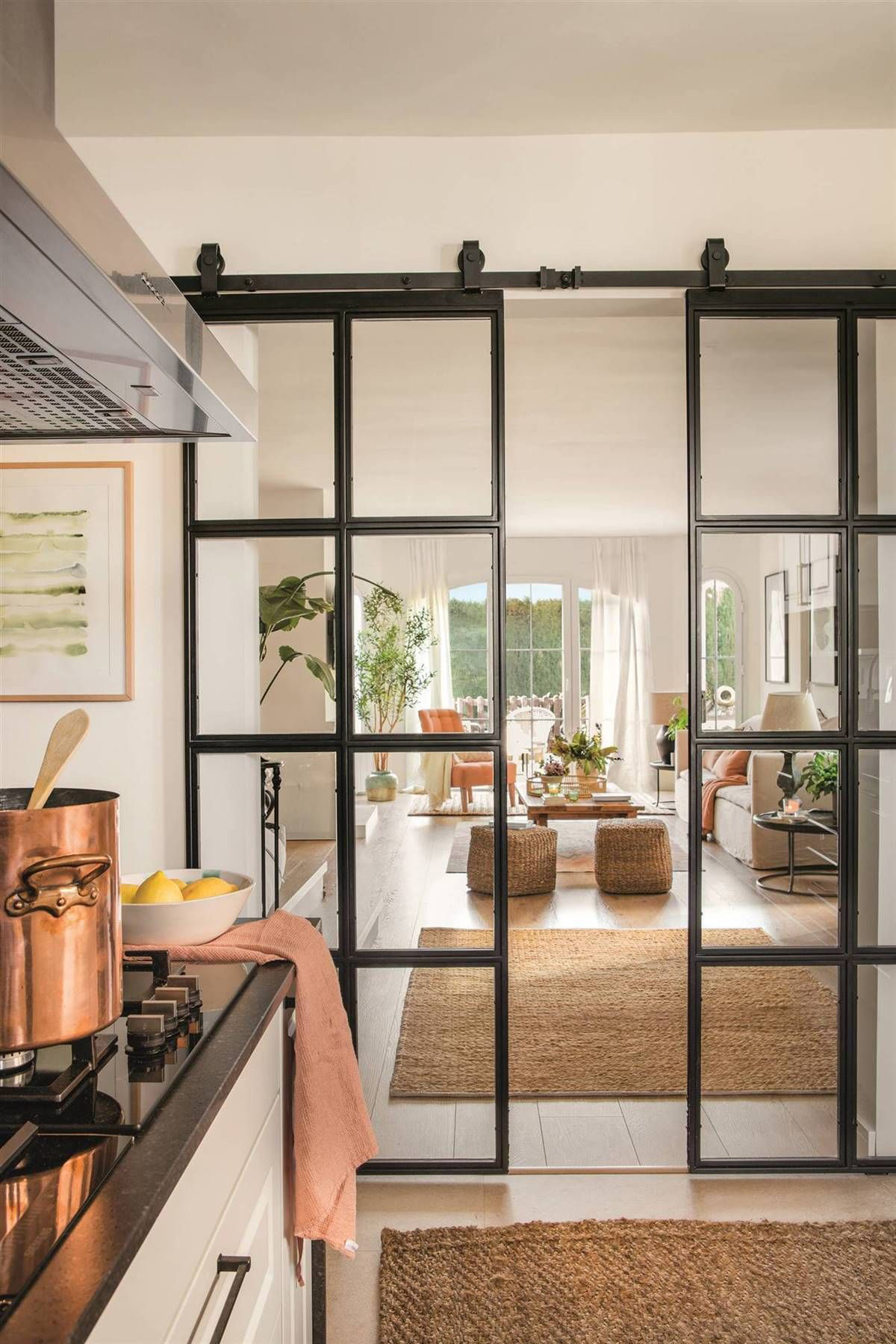 Salon, verrière coulissante grands carreaux.