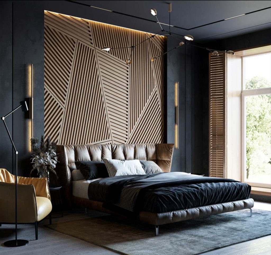 Dans une chambre noire baignée de lumière naturelle, le noir côtoie le bois et le cuir pour un rendu chaleureux et contemporain. La tête de lit spectaculaire en bois aux motifs géométrique ajoute du caractère à cette chambre.