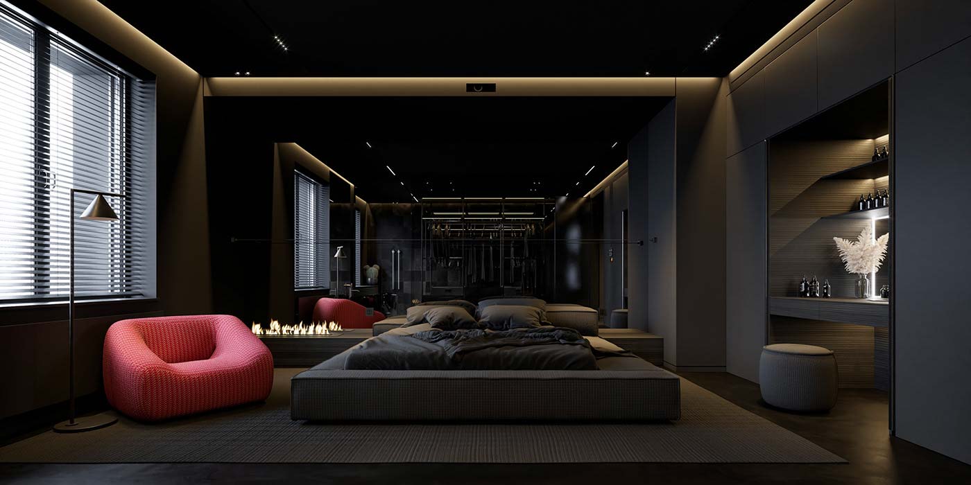 Dans cette chambre minimaliste et noire, on se délecte de toutes les futilités. La tête de lit en miroir offre une sensation d’espace à cette chambre en total look. Le mobilier bas participe également à cette sensation d’espace. Une touche colorée sur un fauteuil rouge permet de réchauffer l’atmosphère tout comme le jeu d’éclairage tamisé. Un coin bureau ou coiffeuse habillé d’herbe de la pampa et positionné dans le renfoncement permet d’ajouter une fonction à cet espace qui se veut sobre et cossu.