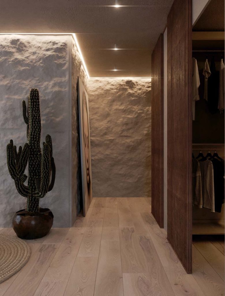 Les tons neutres de la roche peuvent être mis en valeur grâce à un éclairage judicieux. Dans un couloir aux murs de pierre claire, des néons suivent les bords supérieurs des murs, dessinant un chemin lumineux tout en soulignant les aspérités de la roche. Des décorations en bois, des végétaux et même un grand tableau posé à même le sol accentuent cette atmosphère zen rendue par le mur de pierre blanc couleur calcaire.