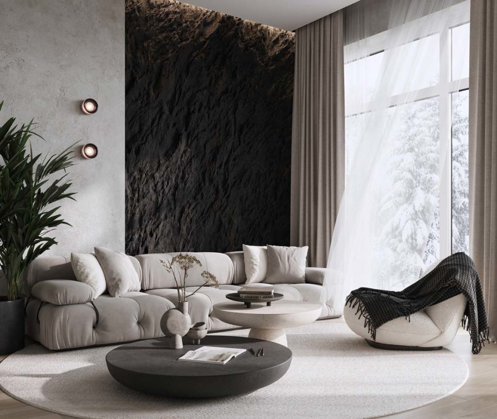 Un pan de mur en pierre apporte au salon une part d’authenticité ainsi qu’une atmosphère chaleureuse. Des assises et des meubles aux formes arrondies adoucissent l’aspect brut de la roche gris anthracite. Les coloris de la pièce s’accordent entre eux pour un ensemble sobre et neutre. Les teintes sombres d’un plaid et d’une table basse se marient avec le mur de pierre, tandis qu’un canapé, un tapis blanc et des rideaux semi-transparents apportent une touche de lumière et de légèreté.